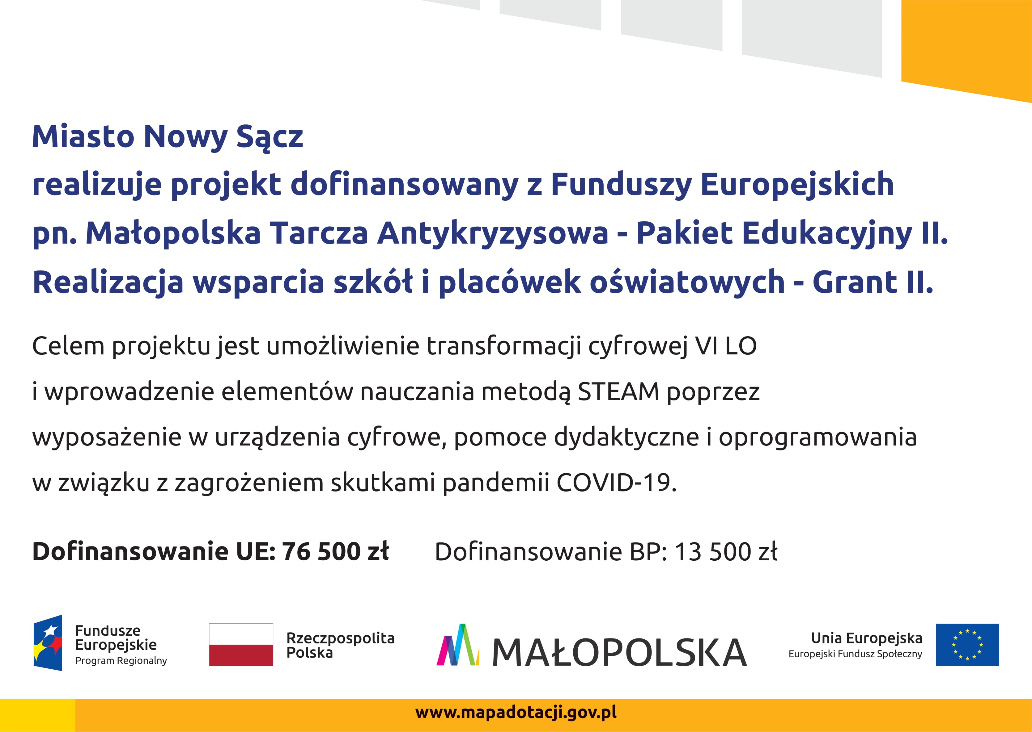 Miasto Nowy Sącz realizuje projekt dofinansowany z Funduszy Europejskich pn. Małopolska Tarcza Antykryzysowa - Pakiet Edukacyjny II. Realizacja wsparcia szkół i placówek oświatowych - Grant II.