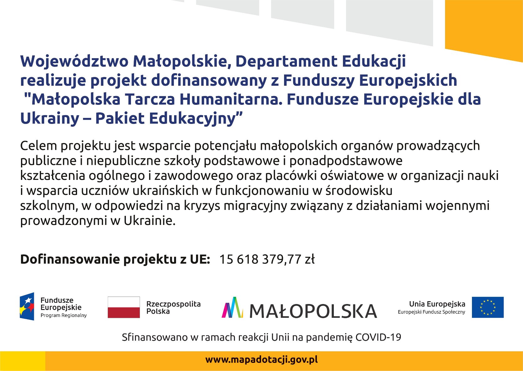 Miasto Nowy Sącz otrzymało grant na realizację zadania w ramach Projektu pn. „Małopolska Tarcza Humanitarna. Fundusze Europejskie dla Ukrainy – Pakiet Edukacyjny” w ramach 15 Osi Priorytetowej REACT-EU (EFS) dla sprostania wyzwaniom migracyjnym, Działanie 15.2 REACT-EU dla sprostania wyzwaniom migracyjnym – pakiet edukacyjny Regionalnego Programu Operacyjnego Województwa Małopolskiego na lata 2014-2020 r.