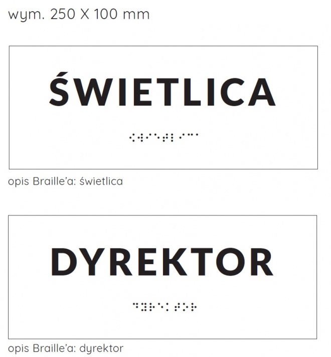 Dzięki zastosowaniu rozwiązań o charakterze informacyjnym, uczniowie mogą w sposób łatwiejszy odnaleźć się w przestrzeni szkolnej. Oznaczenia dostosowane są m.in. do potrzeb osób słabowidzących poprzez użycie opisów w języku Braille’a. Oprócz tabliczek informacyjnych oznaczone zostały również w sposób czytelny oraz dotykowy szafki szatniowe, zaś na drzwiach wejściowych do Szkół zamontowano naklejki kontrastowe.