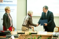 Wiceprezydent Bożena Jawor wraz ze Skarbnikiem Miasta Jadwigą Kusiak podpisały umowę na finansowanie projektu „Pomocna dłoń pod bezpiecznym dachem” prowadzonego przez Regionalny Ośrodek Polityki Społecznej w Krakowie. Uroczystość z udziałem wicemarszałka Wojciecha Kozaka odbyła się w Urzędzie Marszałkowskim.
