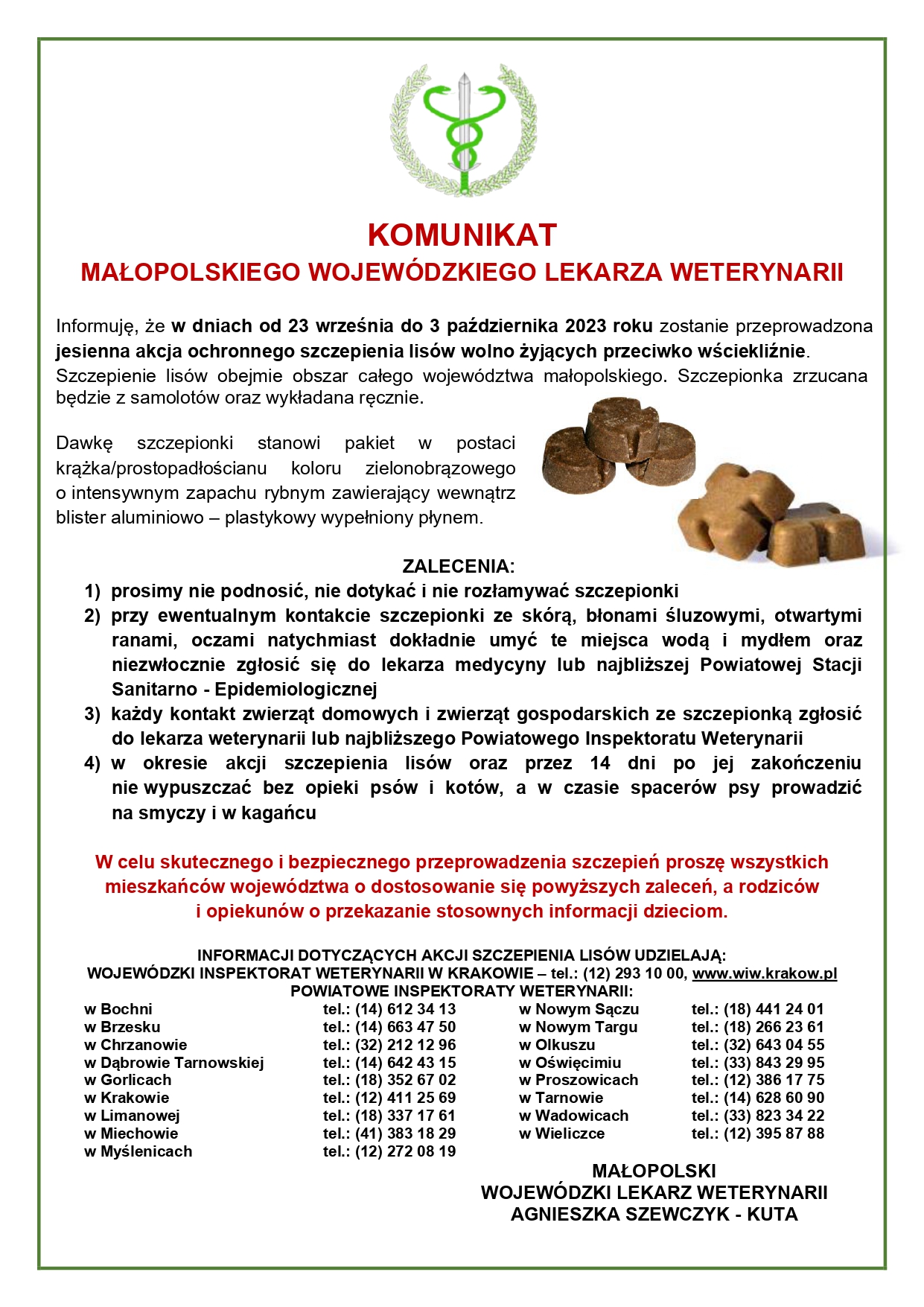 Małopolski Wojewódzki Lekarz Weterynarii informuje, iż w dniach: od 23 września do 3 października 2023 roku zostanie przeprowadzona jesienna akcja ochronnego szczepienia lisów wolno żyjących przeciwko wściekliźnie. Szczepienie lisów obejmie obszar całego województwa małopolskiego.