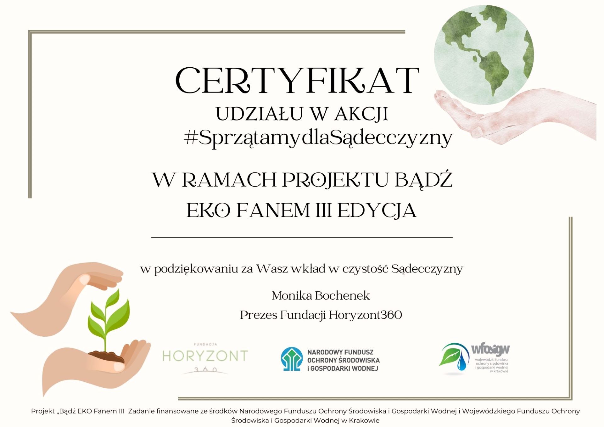 Akcja #sprzątamydlaSądecczyzny, która cieszyła się dużą popularnością nie tylko na terenie miasta Nowego Sącza, właśnie dobiegła końca. Dziękujemy Państwu za udział w tym ważnym dla lokalnej społeczności wydarzeniu i zaangażowanie oraz pomysłodawcy czyli Fundacji Horyzont360 za do budowanie proekologicznych postaw.
