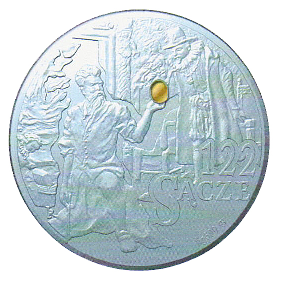 Ten motyw jest też na awersie sądeckiego dukata (bonu towarowego) - "sączem" nazwanego, o nominałach: 4 sącze (mosiężny, obiegowy = 4 zł), 122 sącze (wersja kolekcjonerska - srebrny, z łezką ze złota), który wybiła Mennica Polska.