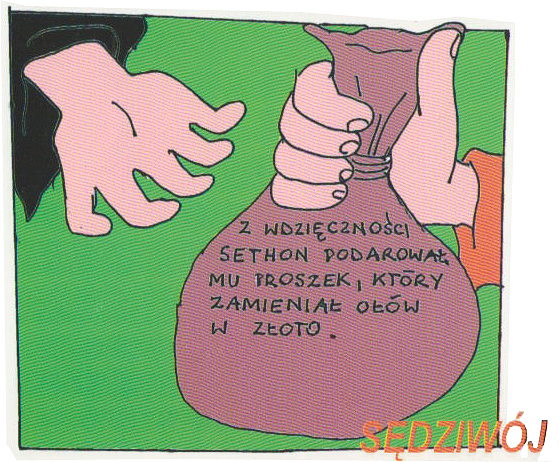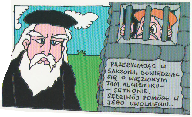 Z wdzięcznością Sethon obdarował polskiego alchemika uncją proszku, który jakoby miał zdolność przemieniania kilograma ołowiu w kilogram złota. Wkrótce Sethon - wyczerpany torturami, których nie szczędzili mu książęcy oprawcy - zmarł, pozostawiając Sędziwojowi w spadku wszystkie swe księgi, tygle i retorty, a przede wszystkim ów proszek oraz... młodą żonę Weronikę.