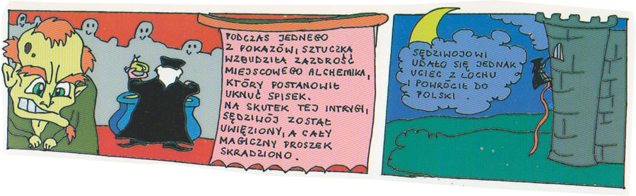 Michał Sędziwój zmarł w roku 1646 i odtąd zaczęto spotykać go znów w Nowym Sączu - kroczył w todze, z podniesioną głową, rynkiem rodzinnego miasta, rozrzucając złote monety. Lśniące krążki bezdźwięcznie padały na ziemię, a sama postać alchemika - nawet w czasie pełni księżyca - nie rzucała cienia.