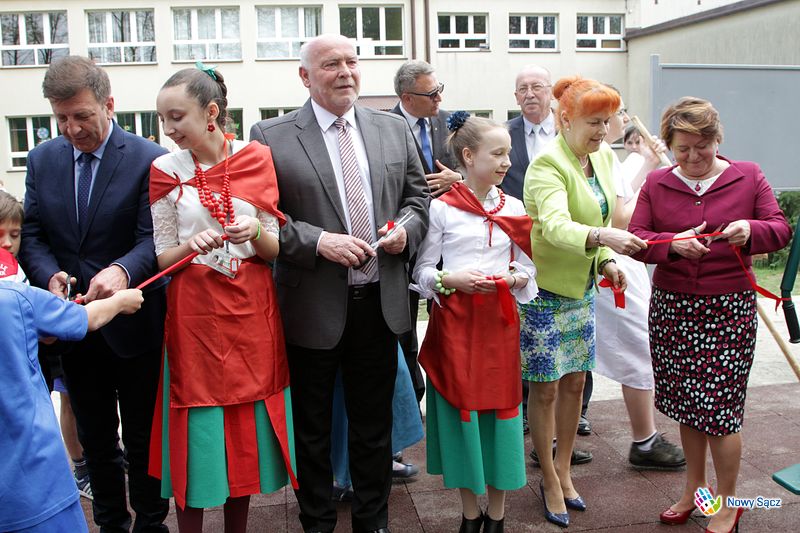 W uroczystości obok zastępcy prezydenta udział wzięli radni Rady Miasta Nowego Sącza Józef Gryźlak i Tadeusz Gajdosz oraz dyrektorzy wydziałów Urzędu Miasta: Inwestycji i Remontów Tomasz Łuczkiewicz i Edukacji Józef Klimek. W roli gospodyń wystąpiły dyrektor szkoły Jadwiga Kopeć i jej zastępczyni Bogumiła Pawlikowska. Boisko i siłownię poświęcił o. Bogdan Długosz SJ z parafii kolejowej.