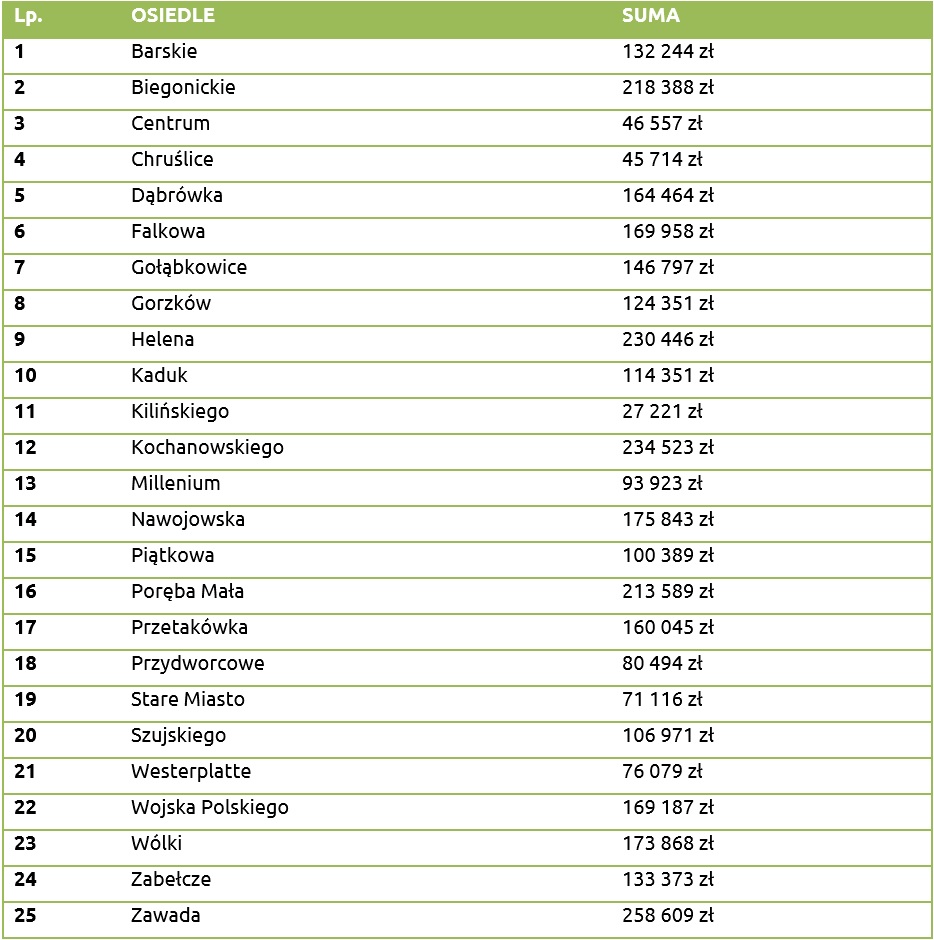 Poniżej prezentujemy kwoty, które mieszkańcy mogą rozdysponować na poszczególnych osiedlach miasta w ramach tegorocznej edycji budżetu obywatelskiego. Należy pamiętać, iż kwota przypadająca dla danego osiedla stanowi maksymalny szacunkowy koszt jednego projektu składanego na danym osiedlu.