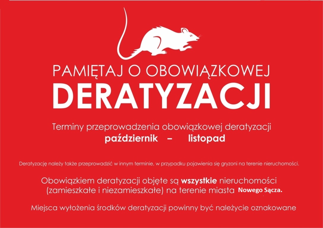 Zgodnie z Regulaminem utrzymania czystości i porządku na terenie miasta Nowego Sącza, przyjętego Uchwałą nr XXVII/258/2020 Rady Miasta Nowego Sącza z dnia 31 stycznia 2020 roku, Deratyzację na terenie Miasta przeprowadza się dwa razy w roku kalendarzowym w sposób ciągły w następujących terminach: