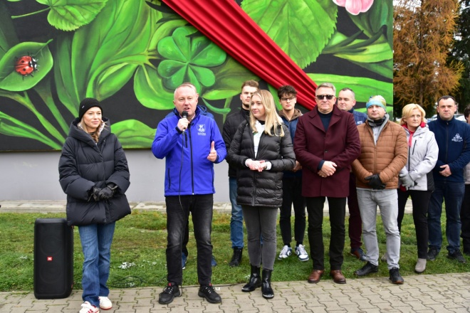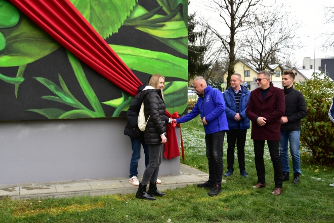 Prezydent Miasta Pan Ludomir Handzel i Wiceprezydent Pani Magdalena Majka wraz z zaproszonymi gośćmi i członkami Stowarzyszenia uroczyście odsłonili mural, który powstał na ścianie bloku przy ul. Królowej Jadwigi 19. Mural namalowano farbą fotokatalityczną usuwającą zanieczyszczenia z powietrza, takie jak dwutlenek siarki, tlenek węgla czy tlenki azotu.