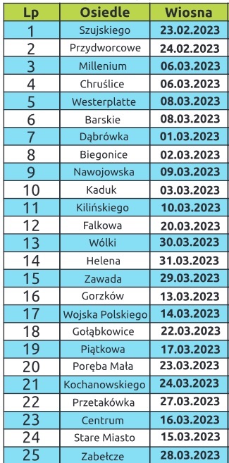Szanowni Państwo, już od 23 lutego na osiedlu Szujskiego rozpoczynamy zbiórkę odpadów wielkogabarytowych, opon oraz zużytego sprzętu elektrycznego i elektronicznego. Odpady należy wystawić najpóźniej do godziny 8.00 w dniu odbioru przed swoje posesje zgodnie z poniższym harmonogramem.