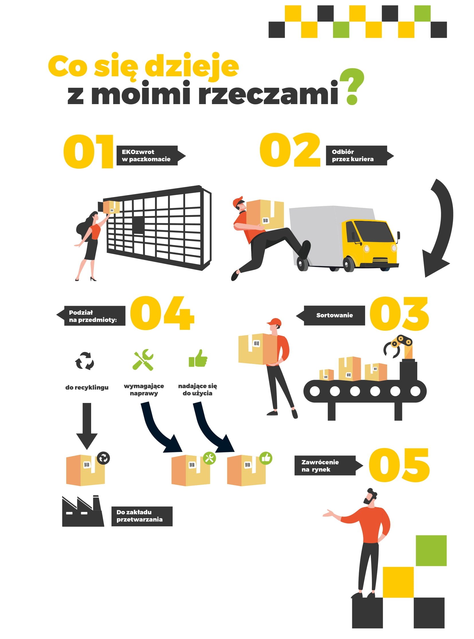 W ramach EKOzwrotów można nadać: tekstylia, elektronikę, obuwie, książki i artykuły dziecięce. Każda paczka nadana jako EKOzwrot zostaje odebrana przez kuriera i dostarczona do sortowni. Wszystkie paczki są ważone, otwierane i sprawdzane pod względem zawartości, a następnie sortowane według asortymentu i oceny stanu przesłanych przedmiotów.