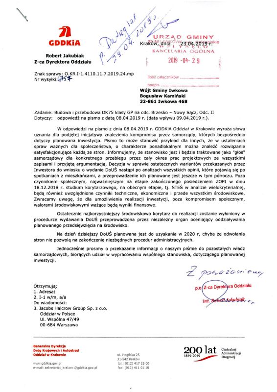 Stanowisko wypracowane przez samorządy i podpisane 4 kwietnia na spotkaniu w Iwkowej, zostało przez wójta gminy wysłane do Ministra Infrastruktury, firmy projektowej oraz Generalnej Dyrekcji Dróg Krajowych i Autostrad, do której należy ostateczna decyzja o przebiegu drogi.