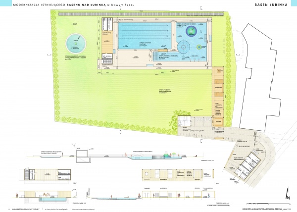 Wokół niecki basenowej zlokalizowana będzie plaża basenowa, a od strony południowej planowana jest strefa plażowa z nawierzchnią trawiastą.