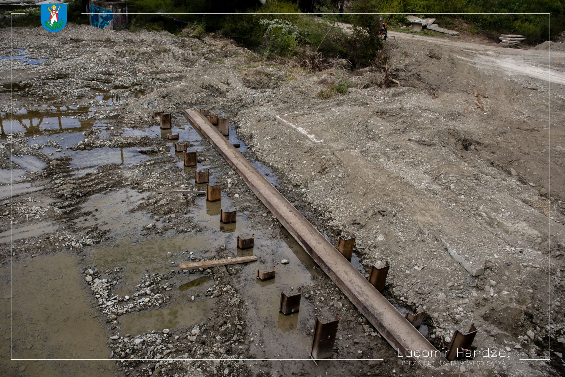 Prace przy budowie tymczasowej przeprawy na rzece Kamienica idą zgodnie z planem. Trwa montaż podpór i przyczółków pod most tymczasowy. Postępom prac przyglądał się prezydent Ludomir Handzel.