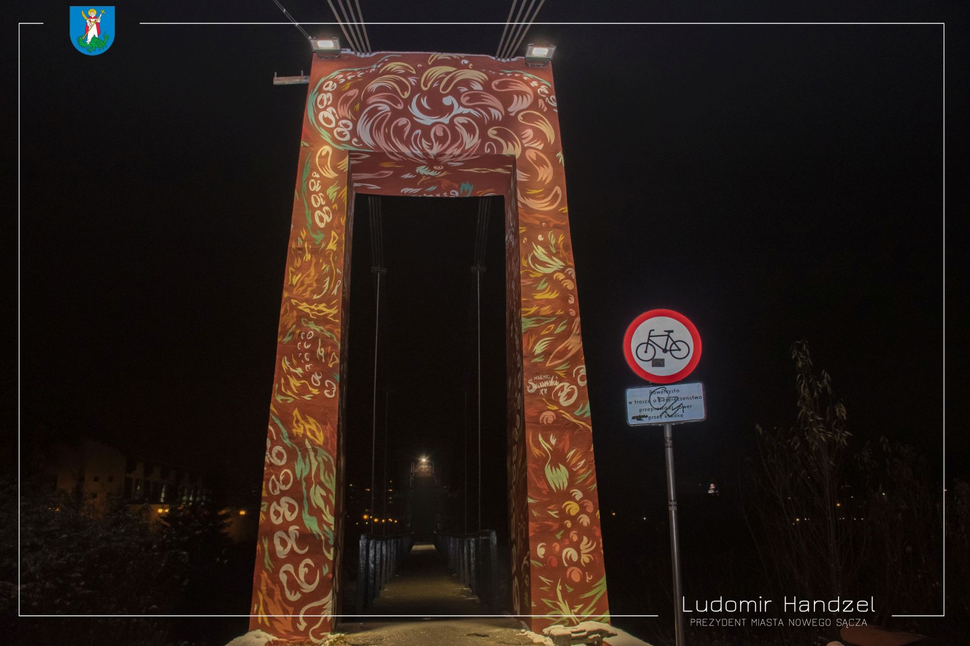 Kładka nad Kamienicą to jedno z kilku miejsc w Nowym Sączu, które podczas zakończonego ostatnio Pierwszego Ulicznego Pleneru Artystycznego „Siew” zyskało zupełnie nowy charakter. To co możemy podziwiać w tym miejscu jest dziełem Pawła Swanskiego, twórcy inspirującego się sztuką folklorystyczną całego świata, co widać pięknie na naszej kładce - kiedyś szarej i niczym się nie wyróżniającej, a teraz niezwykłej i fantastycznie kolorowej. Wymalowanie kładki było nie lada wyzwaniem, zachowanie spójności artystycznej na tego typu obiekcie – kilkuczęściowym, wielopowierzchniowym, wymagało naprawdę nieprzeciętnego talentu. Autor tej pracy, Paweł Swansky, znany jest nie tylko w całek Polsce, jego murale można zobaczyć na ulicach miast i w domach prywatnych w Berlinie, Bristolu, Los Angeles, Toronto, Taiwanie czy w Tokio.
