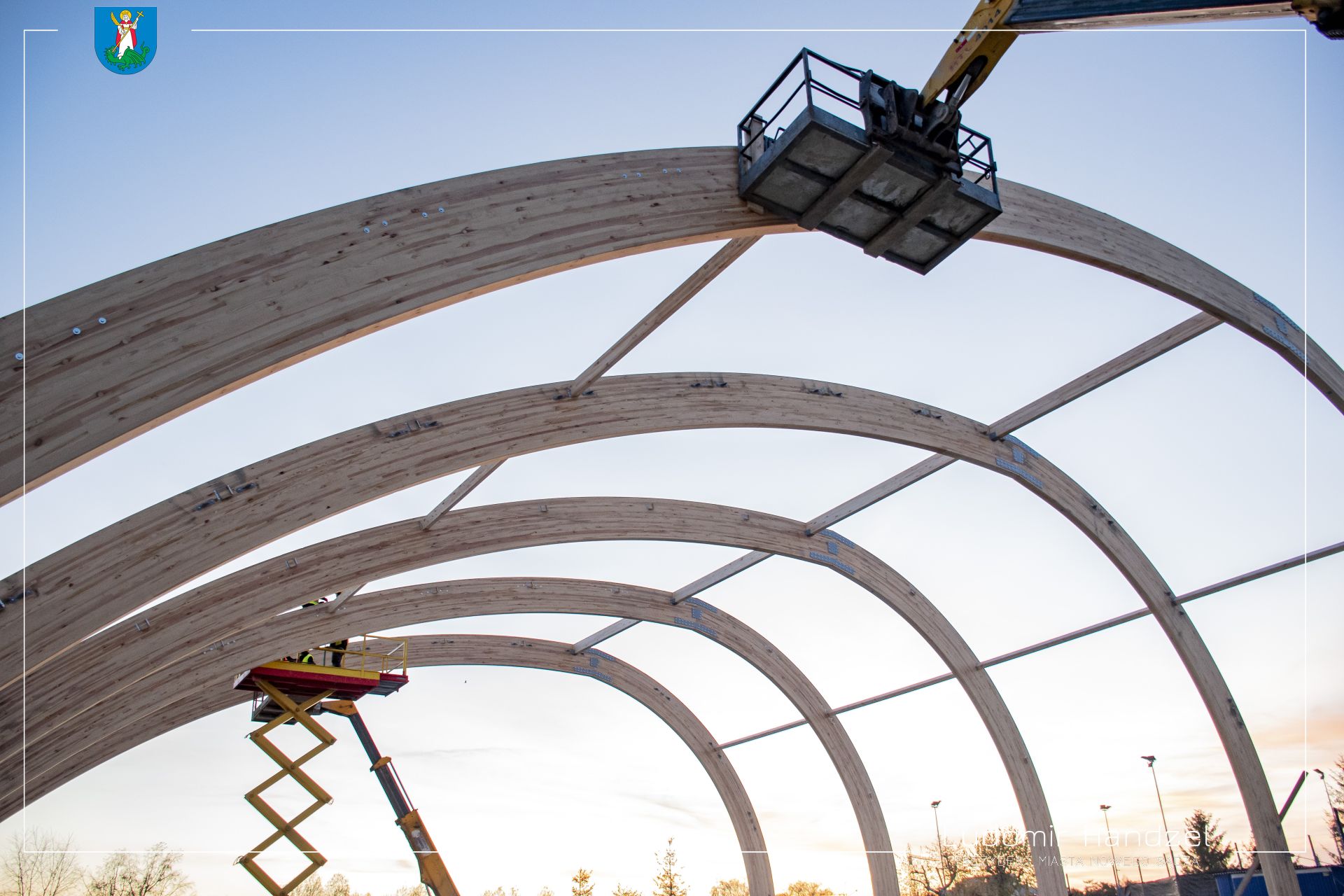 Trwa budowa krytego lodowiska przy ul. Nadbrzeżnej. Obecnie montowane są dźwigary stanowiące konstrukcję obiektu. Została już wykonana płyta mrożeniowa lodowiska wraz z kanałem mrożeniowym oraz instalacje zewnętrzne. W najbliższym czasie planowany jest montaż membrany oraz wykonywanie prac wewnątrz obiektu.