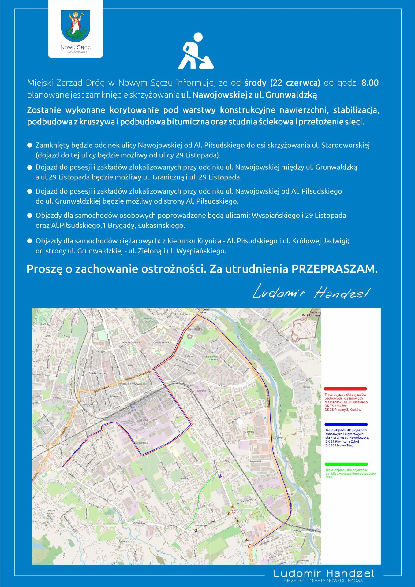 Miejski Zarząd Dróg w Nowym Sączu informuje, że od środy (22 czerwca) od godz. 8.00 planowane jest zamknięcie skrzyżowania ul. Nawojowskiej z ul. Grunwaldzką.Zostanie wykonane korytowanie pod warstwy konstrukcyjne nawierzchni, stabilizacja, podbudowa z kruszywa i podbudowa bitumiczna oraz studnia ściekowa i przełożenie sieci.