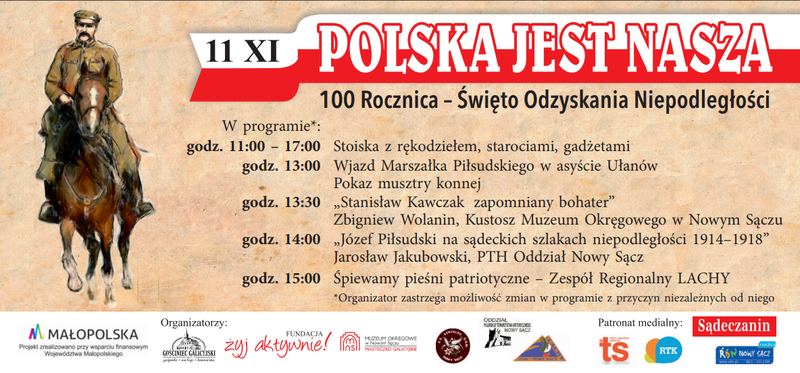 Oficjalne uroczystości związane z rocznicą odzyskania niepodległości odbędą się na Cmentarzu Komunalnym w Nowym Sączu, w kościele św. Kazimierza i pod Dębem Wolności na sądeckich Plantach. W tym dniu sądeczanie będą mieli okazję uczestniczyć także w innych wydarzeniach: śpiewach patriotycznych, spektaklu teatralnym, pikniku patriotycznym, a nawet w podróży "pociągiem wolności".