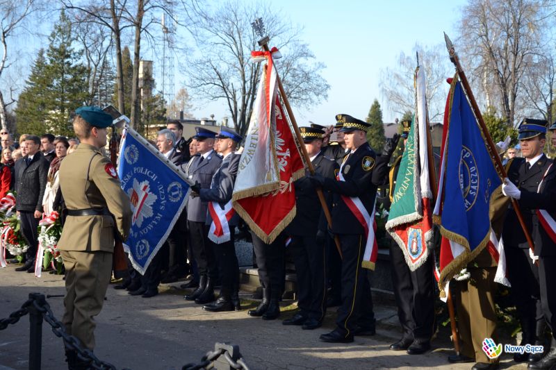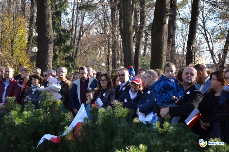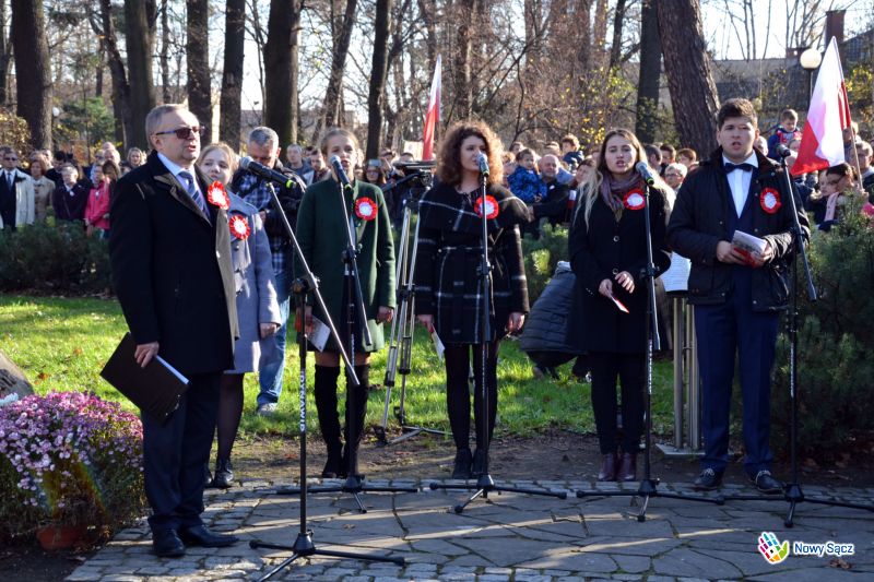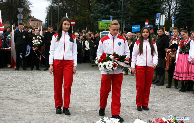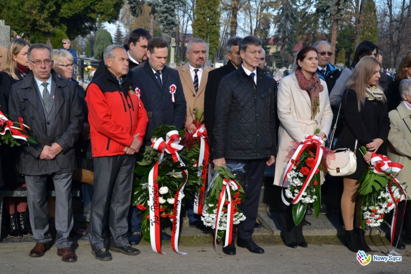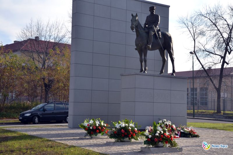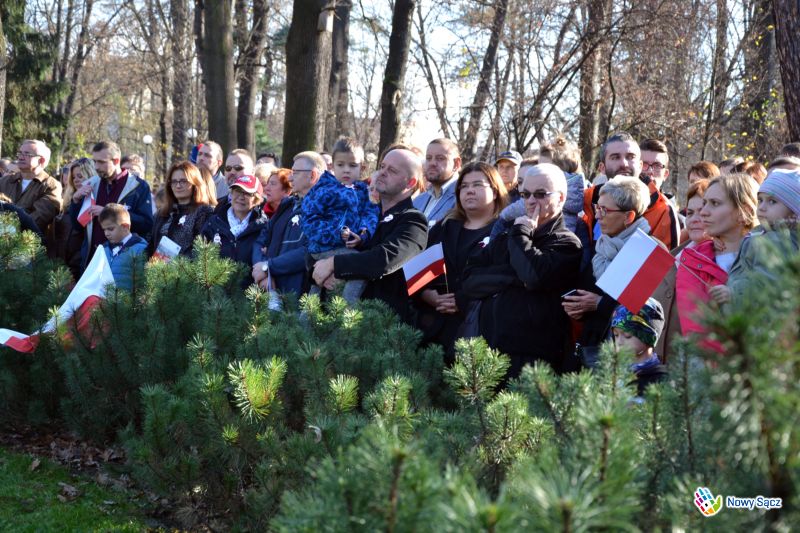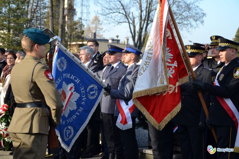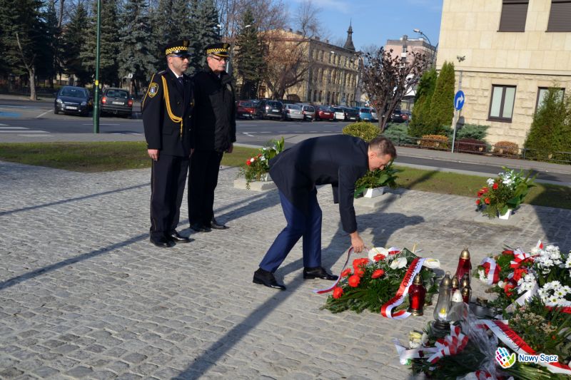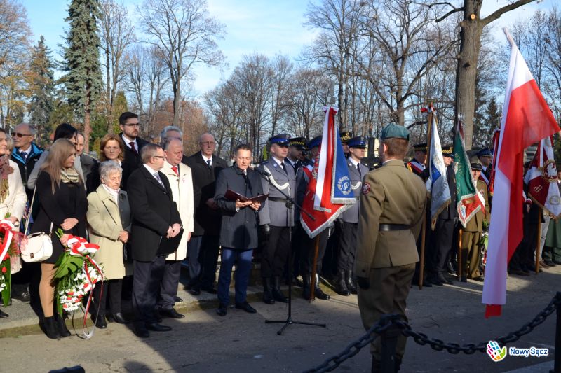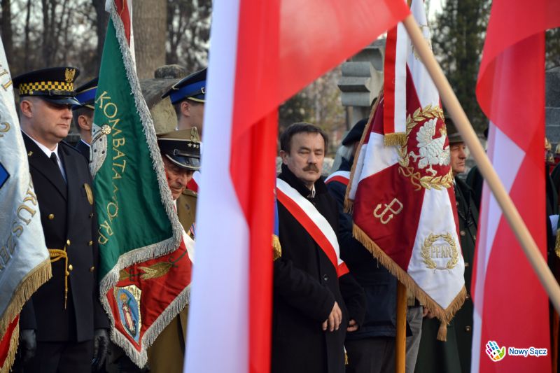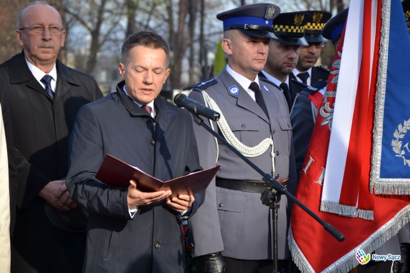 Rocznicowe obchody odzyskania przez Polskę niepodległości rozpoczęły się od złożenia przez zastępcę prezydenta Nowego Sącza Wojciecha Piecha, w asyście komendanta Straży Miejskiej Dariusza Górskiego, kwiatów pod pomnikiem Józefa Piłsudskiego przy Alejach Wolności oraz zapalenia znicza na grobie Bronisława Pierackiego na Starym Cmentarzu.