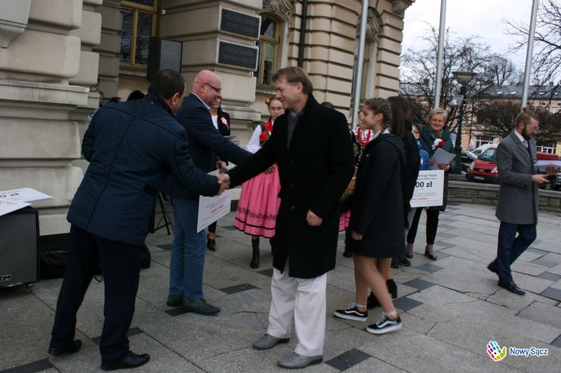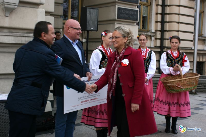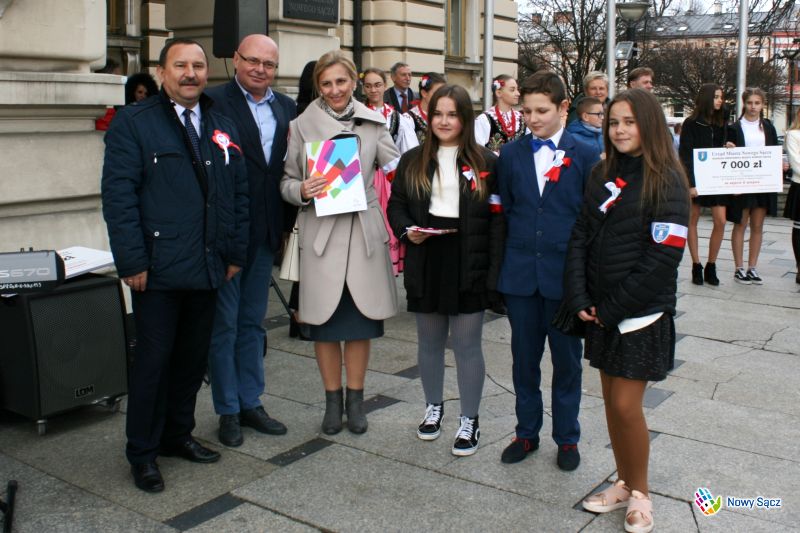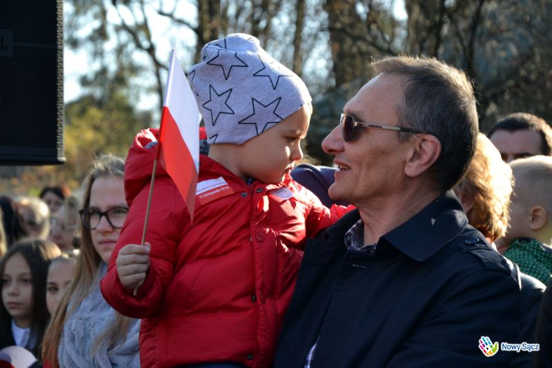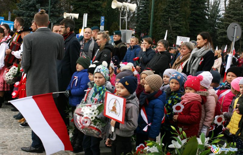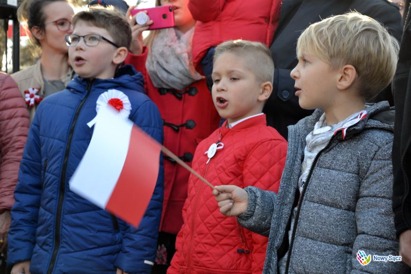 - Szanowni Państwo dyrektorzy, drodzy opiekunowie grup, nauczyciele, kochane dzieci, także te najmłodsze, z sądeckich przedszkoli, drodzy uczniowie. Niezmiernie się cieszę, myślę, że ta że dzisiaj w ten piękny dzień, spotykamy się w tym wyjątkowym miejscu dla sądeczan, w szczególności dla kolejnych pokoleń sądeczan. Właśnie dla Was. Bardzo się cieszę, że właśnie w ten sposób możemy podsumować wszystkie inicjatywy, które Państwo podjęliście, nie tylko w ramach Turnieju Szkół, który był realizowany przez cały rok, ale szereg różnych inicjatyw podejmowanych przez wszystkie jednostki oświatowe a upamiętniających to wyjątkowe wydarzenie, jakim jest stulecie odzyskania przez Polskę niepodległości. Bardzo wam dziękuję za te wszystkie piękne inicjatywy i tym, że mamy wolną, niepodległą Polskę - powiedział dyrektor Wydziału Edukacji Józef Klimek, po czym, wraz z Zespołem Regionalnym „Sądeczoki” z Pałacu Młodzieży, wszyscy zaśpiewali „Mazurka Dąbrowskiego”. Uczniowie złożyli również wiązanki kwiatów pod pomnikiem. Wartę honorową pełnili sądeccy Strzelcy.