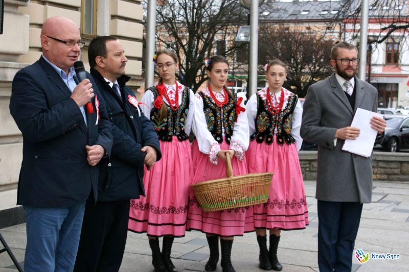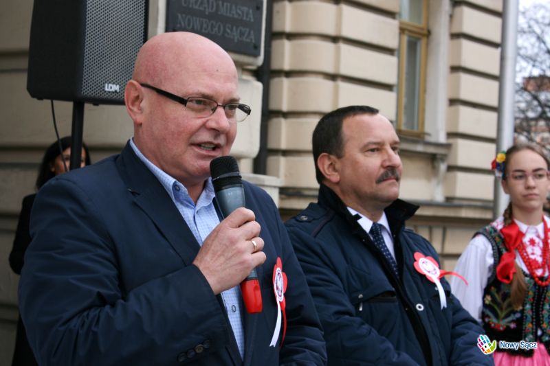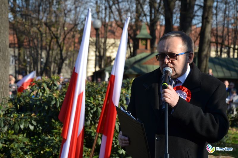 "Drodzy Sądeczanie, patrioci! Sto lat temu, po 123 latach rozbiorów, a na Sądecczyźnie po 148 latach mógł zabrzmieć Mazurek Dąbrowskiego. Polska powróciła na mapę Europy. Wracamy do wydarzeń sprzed wieku, bo to nasz obowiązek wobec historii i tych, którzy ją kreowali: bohaterów znanych z imienia i nazwiska i tych licznych bezimiennych. Wracamy do tamtych chwil, bo to nasze święto, bo bez tych bohaterów, kto wie, może nie moglibyśmy się tutaj spotkać. Oddajemy więc hołd uczestnikom tragicznie zakończonych zrywów niepodległościowych: Powstania Listopadowego w 1831 roku, próby uwolnienia się od zaborców w 1848 roku i Powstania Styczniowego w 1863 roku. Dla tych organizacji, stowarzyszeń i ruchów naszych poprzedników, którzy nie pogodzili się z utratą suwerenności, zawołanie „Dla Ciebie Polsko i dla Twojej chwały” nie było frazesem, ani pustosłowiem. Dla Polski gotowi byli na największe poświęcenia, prześladowania, więzienie, zsyłki, a nawet ofiarę ostateczną.