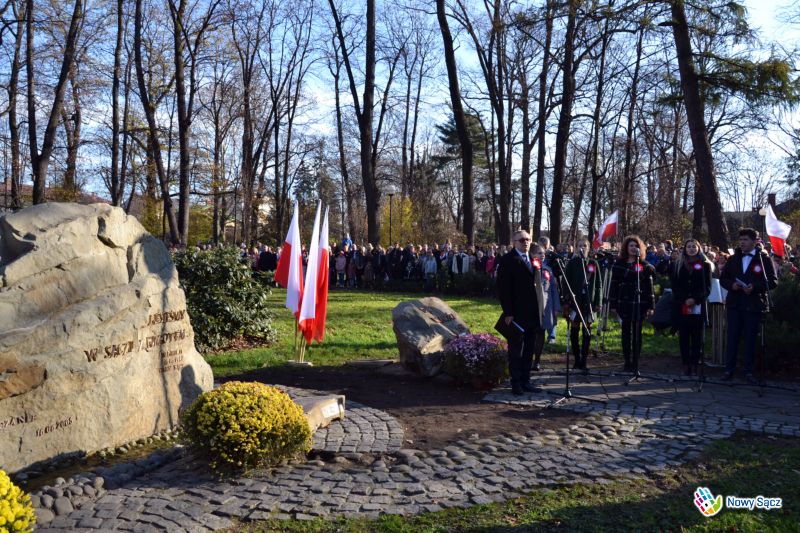 Obchodzona dziś rocznica odzyskania przez Polskę niepodległości jest też dla nas okazją do uhonorowania "ikony" Odrodzonej - komendanta Związku Strzeleckiego, komendanta Legionów Polskich, późniejszego marszałka i naczelnika państwa polskiego Józefa Piłsudskiego. To stamtąd dzisiaj wracamy na to miejsce, gdzie przed chwilą złożyliśmy wiązanki kwiatów w imieniu miasta i wszystkich mieszkańców. Szanowni Państwo! Sądzę, że obchody setnej rocznicy odzyskania niepodległości przez Polskę w naszym mieście były godne i stosowne do tej niepowtarzalnej rocznicy. Włączyły się w nie szkoły, organizacje pozarządowe, placówki kultury, a także instytucje podległe prezydentowi. Obok Dębu Wolności, posadzonego przed stu laty na Sądeckich Plantach zasadziliśmy Dąb Niepodległości, podarowany społeczności "długoszowej rodziny" przez pierwszą parę Rzeczypospolitej Polskiej – prezydenta Andrzeja Dudę i jego małżonki Agatę Kornhauser-Dudę. Doczesne szczątki legionisty, piłsudczyka, ministra i generała Bronisława Pierackiego powróciły na pierwotnie przewidziane miejsce, do odtworzonego mauzoleum. Przy Alejach Wolności stanął godny i okazały pomnik marszałka Józefa Piłsudskiego. Odsłonięty kilkanaście dni temu, jest spełnieniem woli naszych poprzedników, którym nie udało się uhonorować Józefa Piłsudskiego monumentem, tuż po jego śmierci. Na mury Baszty Kowalskiej powróciły odtworzone tablice żołnierzy I Pułku Strzelców Podhalańskich, poległych w wojnie 1920 roku z bolszewikami. To najważniejsze akcenty naszych sądeckich obchodów stulecia odzyskania niepodległości […].