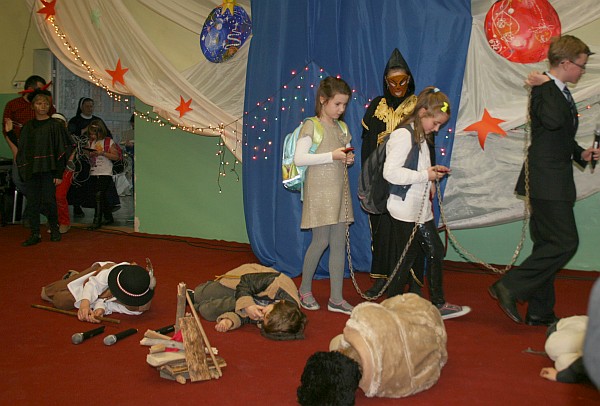 Nie zabrakło życzeń, świątecznego poczęstunku, wspólnego kolędowania i przedstawienia bożonarodzeniowego w wykonaniu uczniów ZSP-G nr 2. Młodzież zaprezentowała jasełka, których przesłaniem była walka o młode pokolenie, narażone na zagrożenia ze strony internetu i telewizji.