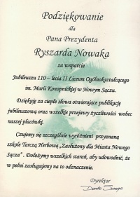 Dyrektor Dorota Smaga przekazała również w imieniu szkoły podziękowania dla prezydenta za wszelką pomoc oraz życzliwość wobec II LO. „Czujemy się szczególnie wyróżnieni przyznaną szkole Tarczą Herbową „Zasłużony dla Miasta Nowego Sącza”. Dołożymy wszelkich starań, aby udowodnić, że w pełni zasługujemy na to odznaczenie.”