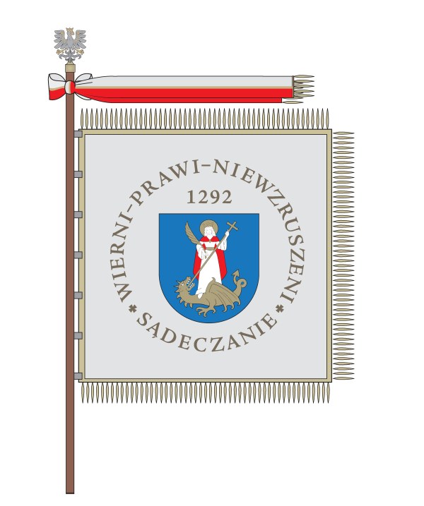 Ma postać kwadratowego, dwustronnego płata materiału, wykończonego złotymi frędzlami, przymocowanego do drzewca zwieńczonego głowicą w kształcie Orła – herbu województwa małopolskiego, poniżej której szarfa w barwach województwa małopolskiego. Na prawym płacie czerwonym Orzeł Biały, godło Rzeczypospolitej Polskiej, w złotym wieńcu laurowym. Na płacie lewym srebrnym herb miasta Nowego Sącza, nad tarczą data lokacji miasta 1292, wokół tarczy dewiza: SĄDECZANIE - WIERNI – PRAWI - NIEWZRUSZENI. Litery napisu haftowane nicią złotą, obramienie prawego i lewego płata sztandaru złote. Dewizę umieszczoną na sztandarze zaczerpnięto z dokumentu Jadwigi, żony Władysława Łokietka. Staropolskie słowo „niewzruszeni” oznacza: godny zaufania, niezawodny, nieprzezwyciężony, mocny, silny, niezmienny, nieugięty.