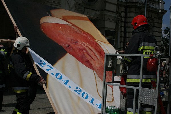 A już dzisiaj sądeccy strażacy, na balkonie ratusza, montowali portret Ojca Świętego. Będzie on przypominał o zbliżającej się kanonizacji.