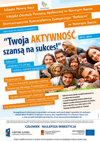 Oferta projektu skierowana jest do osób między 15 a 24 rokiem życia, mieszkających na terenie miasta Nowego Sącza (gimnazjaliści, licealiści, studenci!). Organizatorzy przewidują możliwość uczestnictwa w licznych zajęciach wspomagających czynny rozwój. W ramach modułu, zależnie od deklarowanych potrzeb,, zapewniona zostanie szansa skorzystania ze wsparcia w postaci m.in: treningów kompetencji społecznych; warsztatów i konsultacji indywidualnych z zakresu doradztwa zawodowego, ułatwiającego poruszanie się na rynku pracy: zajęć z projektowania, tworzenia i prowadzenia stron www, warsztatów kreatywnego myślenia (nauka szybkiego czytania i przyswajania wiedzy), wizyt studyjnych oraz spotkań z cenionymi przedsiębiorcami.