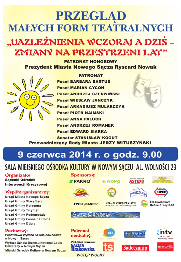 W poniedziałek 9 czerwca w Miejskim Ośrodku Kultury, pod patronatem Prezydenta Miasta Nowego Sącza Ryszarda Nowaka, odbędzie się XIV Przegląd Małych Form Teatralnych - "PRZEBUDZENIE 2014". Tegoroczne hasło przeglądu to: "Uzależnienia wczoraj i dziś - zmiany na przestrzeni lat".