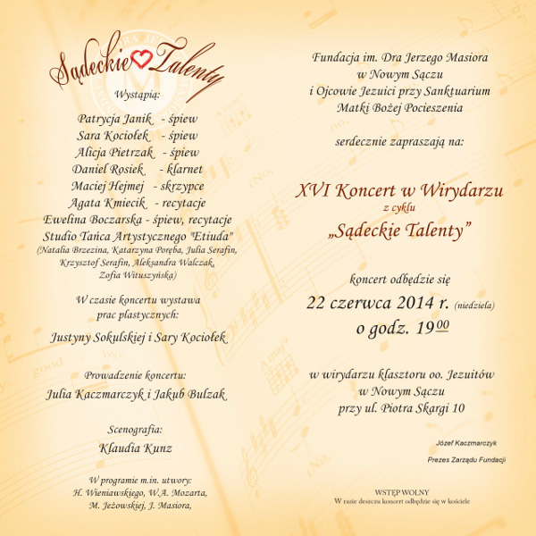 22 czerwca o godz. 19:00, w klasztorze oo. Jezuitów przy ul. Piotra Skargi 10, odbędzie się XVI Koncert w Wirydarzu z cyklu "Sądeckie Talenty". Organizatorem wydarzenia jest Fundacja im. Dra Jerzego Masiora.