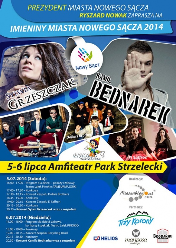W niedzielę zapraszamy również na godz. 16.00. Przez dwie godziny z artystami z Teatru Lalek Pinokio bawić się będą najmłodsi. Około godz. 19:00 rozpocznie się koncert krakowskiego zespołu z sądeckimi korzeniami - Recycling Band, finalistów V edycji programu Mam Talent. Zespół gra na własnoręcznie wykonanych z odpadów instrumentach muzycznych. Następnie, około 20.30 na scenie pojawi się Kamil Bednarek - wokalista, kompozytor, autor tekstów. Finalista programów muzycznych Mam Talent, Bitwa na Głosy. Debiutancki krążek zatytułowany “Jestem…”, osiągnął status platyny. Koncert Kamila Bednarka zakończy tegoroczne Imieniny Miasta.