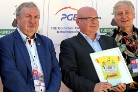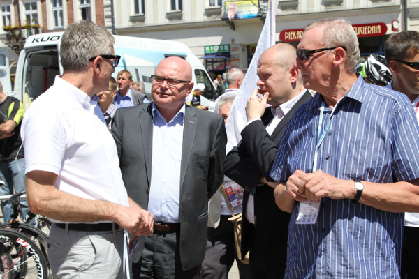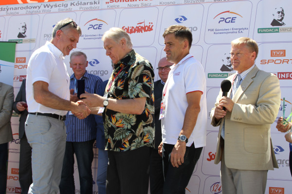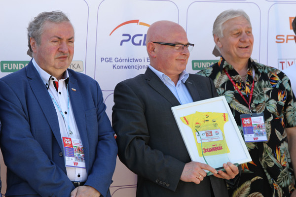 Waldemar Krenc, przewodniczący komitetu organizacyjnego, wręczył prezydentowi Ryszardowi Nowakowi symboliczną żółtą koszulkę lidera, jubileuszowego 25. Międzynarodowego Wyścigu Kolarskiego Solidarności i Olimpijczyków.