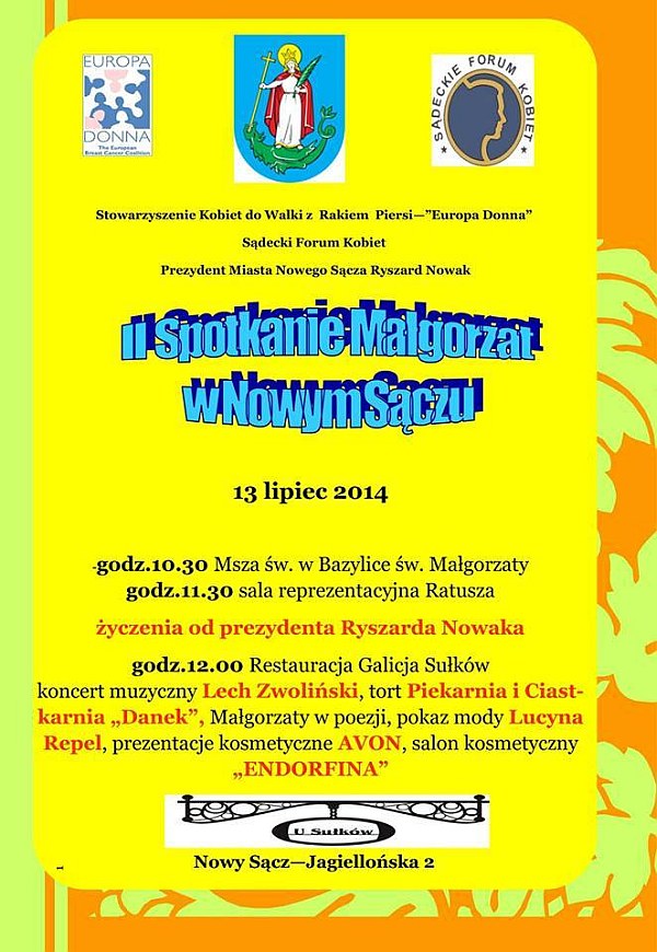 Prezydent Miasta Nowego Sącza Ryszard Nowak zaprasza na II Spotkanie Małgorzat 13 lipca 2014r. w Nowym Sączu. II Spotkanie Małgorzat odbywa się z inicjatywy Sądeckiego Forum Kobiet i Stowarzyszenia Kobiet do Walki z Rakiem Piersi Europa Donna.