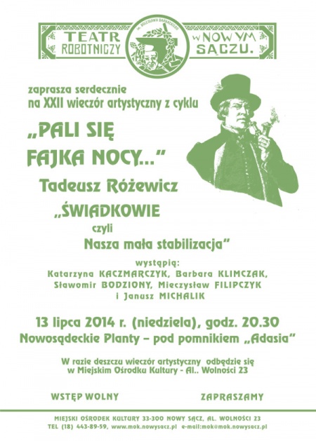 13 lipca o godz. 20:30 na nowosądeckich Plantach, pod pomnikiem Adama Mickiewicza, aktorzy Teatru Robotniczego im. B. Barbackiego zaprezentują dramat Tadeusza Różewicza pt. "Świadkowie, czyli nasza mała stabilizacja".