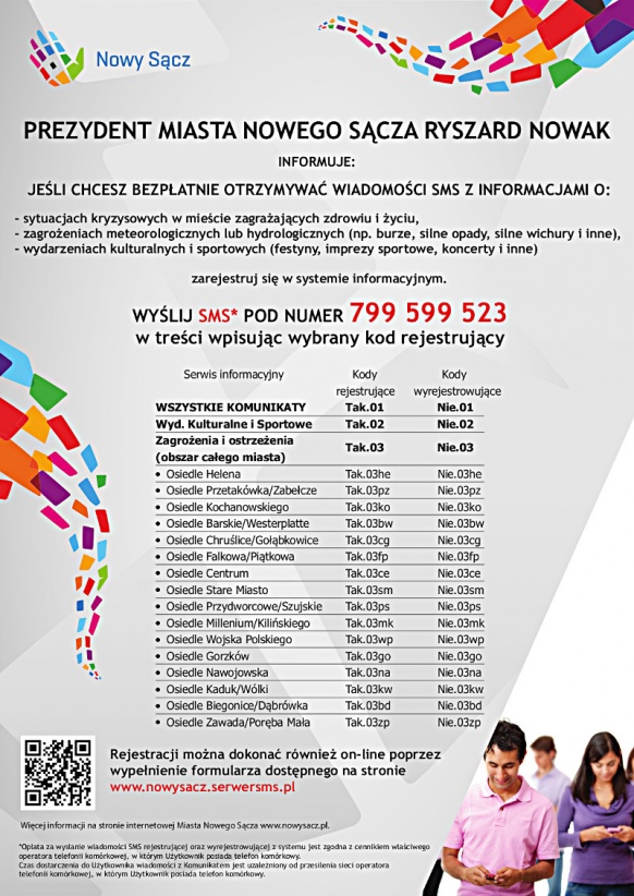 - Pierwsze informacje dotrą do zarejestrowanych osób już 1 sierpnia, a wszystkie informacje dotyczące zasad rejestracji zamieszczone będą na stronie internetowej Nowego Sącza w zakładce: INFORMACJE- Miejski System Powiadamiania SMS oraz dotrą bezpośrednio do mieszkańców za pomocą ulotek i plakatów. Główną funkcjonalnością tego systemu jest możliwość dotarcia z ważną lub ciekawą wiadomością, w bardzo krótkim czasie do tysięcy mieszkańców. Każdy zainteresowany może otrzymywać informacje na temat zagrożeń kryzysowych zaistniałych na terenie całego miasta lub wybranego osiedla czy ciekawych imprez kulturalnych i sportowych, organizowanych na terenie miasta Nowego Sącza – powiedział Dyrektor Wydziału Zarządzania Kryzysowego Marek Nieć zachęcając do rejestrowania się jak najszerszej grupy mieszkańców.