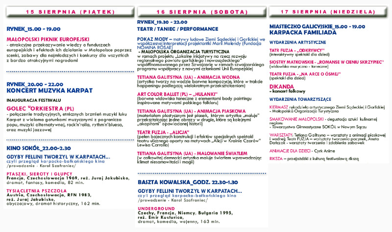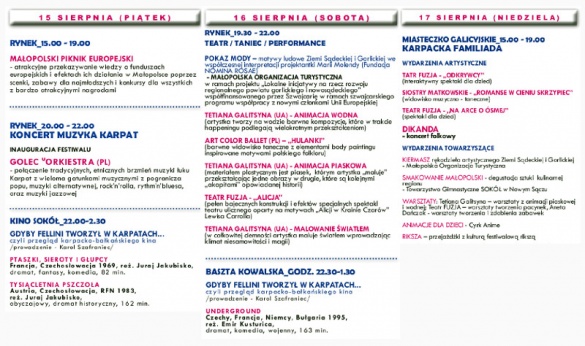 Małopolskim Piknikiem Europejskim na płycie sądeckiego Rynku zostanie zainaugurowany VI Międzynarodowy Multimedialny Festiwal Sztuki Karpaty OFFer. Wydarzenie odbywa się dniach 15-17 sierpnia. W programie m.in. koncerty, spektakle dla dzieci, widowiska muzyczno-taneczne czy warsztaty i kiermasze.