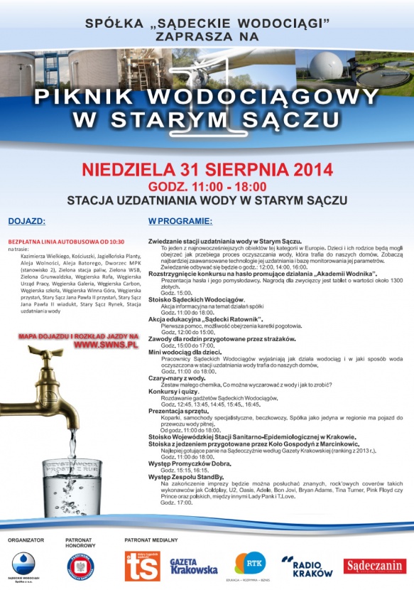 Od godziny 10:30 na trasie ul. Kazimierza Wielkiego Nowy Sącz - Stacja Uzdatniania Wody Stary Sącz, będzie kursować bezpłatna linia autobusowa dowożąca uczestników pikniku. Szczegóły na plakacie.