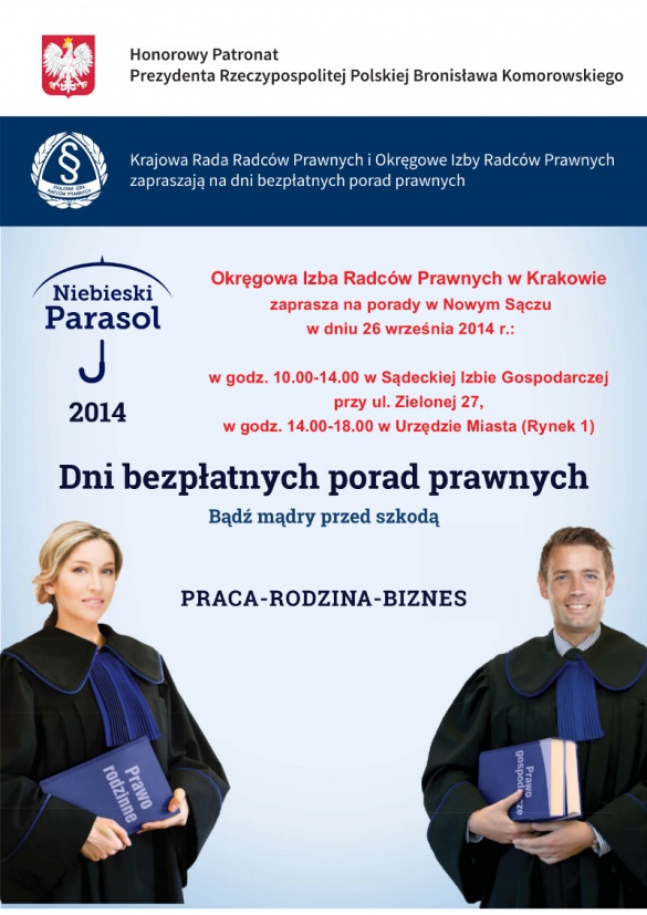 26 września 2014 roku Okręgowa Izba Radców Prawnych w Krakowie zaprasza na bezpłatne porady prawne. Prawnicy na wszystkich zainteresowanych czekać będą w Nowym Sączu, przed południem (10.00-14.00) na ul. Zielonej 27 w budynku Sądeckiej Izby Gospodarczej oraz w godz. 14.00- 18.00 w Urzędzie Miasta, Rynek 1. Akcję bezpłatnych porad prawnych, wspiera prezydent Nowego Sącza Ryszard Nowak.