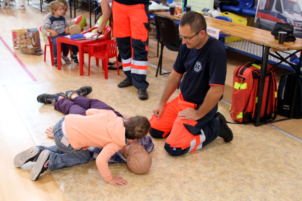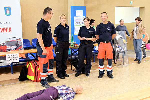 Krótkie szkolenie dla wszystkich uczestników z zakresu pierwszej pomocy przeprowadzili ratownicy Sądeckiego Pogotowia: Krzysztof Olejnik i Dariusz Potoczek. Każdy mógł poćwiczyć, na profesjonalnym fantomie ratowniczym, wykonywanie czynności resuscytacyjnych.