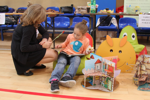 - Sądecka Biblioteka Publiczna - punkt informacyjny, stanowisko z książeczkami dla najmłodszych