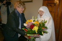 Na zakończenie urodzinowego spotkania siostra dziękowała za pamięć, życzenia i prezent, który otrzymała od prezydenta Ryszarda Nowaka. To tradycyjnie plik papeterii, znaczki, długopisy i kwiaty.