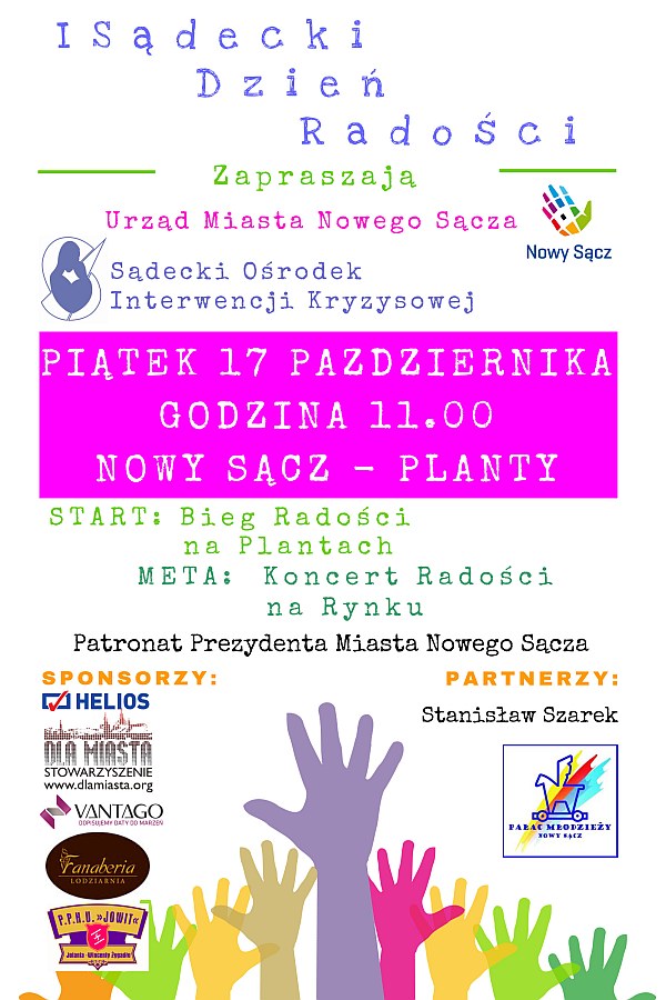 17 października, o godz. 11.00 odbędzie się happening młodzieżowy „I Sądecki Dzień Radości”. Organizatorami spotkania są Urząd Miasta Nowego Sącza wraz z Sądeckim Ośrodkiem Interwencji Kryzysowej w Nowym Sączu oraz Stanisław Szarek. Patronat nad happeningiem objął Prezydent Miasta Nowego Sącza Ryszard Nowak.