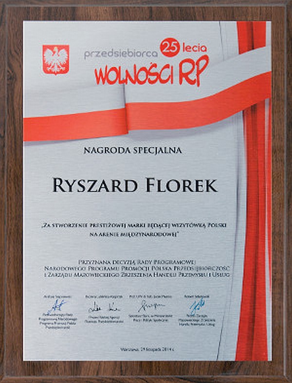 Ryszard Florek nagrodzony tytułem Przedsiębiorca 25-lecia Wolności RP Nagroda Specjalna przyznana Prezesowi FAKRO „za stworzenie prestiżowej marki będącej wizytówką Polski na arenie międzynarodowej” stanowi uznanie dla wkładu jaki Ryszard Florek wniósł w budowę polskiej gospodarki i wizerunku naszego kraju na świecie. Zapoczątkowana w 1989 gospodarka wolnorynkowa przyniosła Polsce najpierw załamanie koniunktury gospodarczej, a później zagraniczne inwestycje. Jest jednak szereg firm, które poradziły sobie z transformacją, podbiły polski rynek i dziś odnoszą ogromne sukcesy na świecie. Takim przykładem jest historia firmy FAKRO. Powstała w 1991 roku jako spółka prywatna, oparta w stu procentach na polskim kapitale firma w ciągu 20 lat z małego, rodzinnego zakładu rozwinęła się w międzynarodową korporację i dzisiaj zajmuje pozycję wicelidera na światowym rynku okien dachowych. Produkty firmy FAKRO udowadniają, że produkty z Polski są bezpieczne, innowacyjne i świetnej jakości, umacniając tym samym pozytywny wizerunek Polski za granicą.
