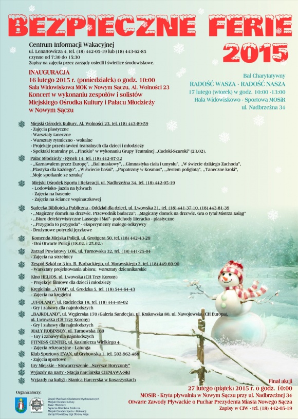 W poniedziałek 16 lutego koncertem w sali widowiskowej Miejskiego Ośrodka Kultury zostaną zainaugurowane "Bezpieczne Ferie 2015". Podczas koncertu wystąpią soliści i zespoły z Pałacu Młodzieży oraz Miejskiego Ośrodka Kultury. O szczegółach organizowanych w okresie ferii wydarzeń poinformował podczas konferencji prasowej w sądeckim ratuszu Jerzy Gwiżdż, zastępca prezydenta miasta, a także Milenia Małecka-Rogal. Kwestie bezpieczeństwa przedstawił podinsp. Krzysztof Chochliński, Naczelnik Wydziału Prewencji Komendy Miejskiej Policji w Nowym Sączu.
