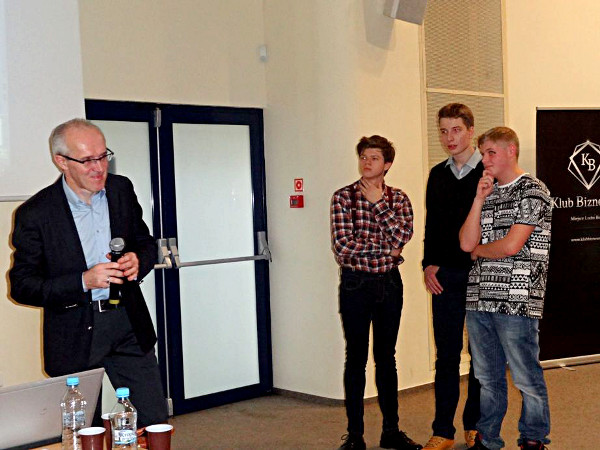 W drugiej części wykładu został przeprowadzony quiz wiedzy o transporcie. Dzięki niemu wiemy teraz, że Polska zajmuje drugie miejsce w Europie pod względem przewozu towarów, ile jest ciężarówek w Polsce, jak również ile kilometrów rocznie przebywają ciężarówki w firmie Zet Transport. Pan Jan Załubski dzielił się z nami swoim ponad 20 letnim doświadczeniem w prowadzeniu swojej firmy. Opowiadał o historii powstania firmy, jak zaczynał swoją działalność na rynku transportu międzynarodowego oraz jaką drogę przebył aby dziś zarządzać ponad 150 ciągnikami siodłowymi wraz z naczepami oraz blisko 300 pracownikami.