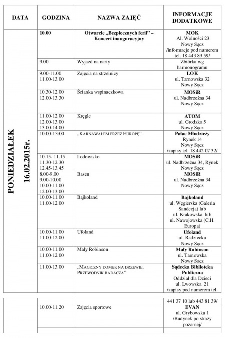 Już jutro (16 lutego) ruszają zimowe ferie. Na terenie miasta Nowego Sącza dzieci i młodzież mogą skorzystać z bogatej oferty w ramach "Bezpiecznych Ferii 2015". Każdego dnia czekają liczne atrakcje, a na dodatkowe zajęcia można zapisywać dzieci w zarządach osiedli, świetlicach środowiskowych, a także w placówkach będących partnerami akcji.