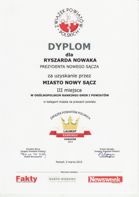 Nowy Sącz został nagrodzony podczas Kongresu XXV-lecia Samorządu Terytorialnego za zajęcie 3 m. w Rankingu Miast na Prawach Powiatu. O wynikach Nowego Sącza w rankingu informowaliśmy szerzej w styczniu br. w komunikacie: Nowy Sącz laureatem 3. miejsca w Rankingu Miast na Prawach Powiatu 2014.